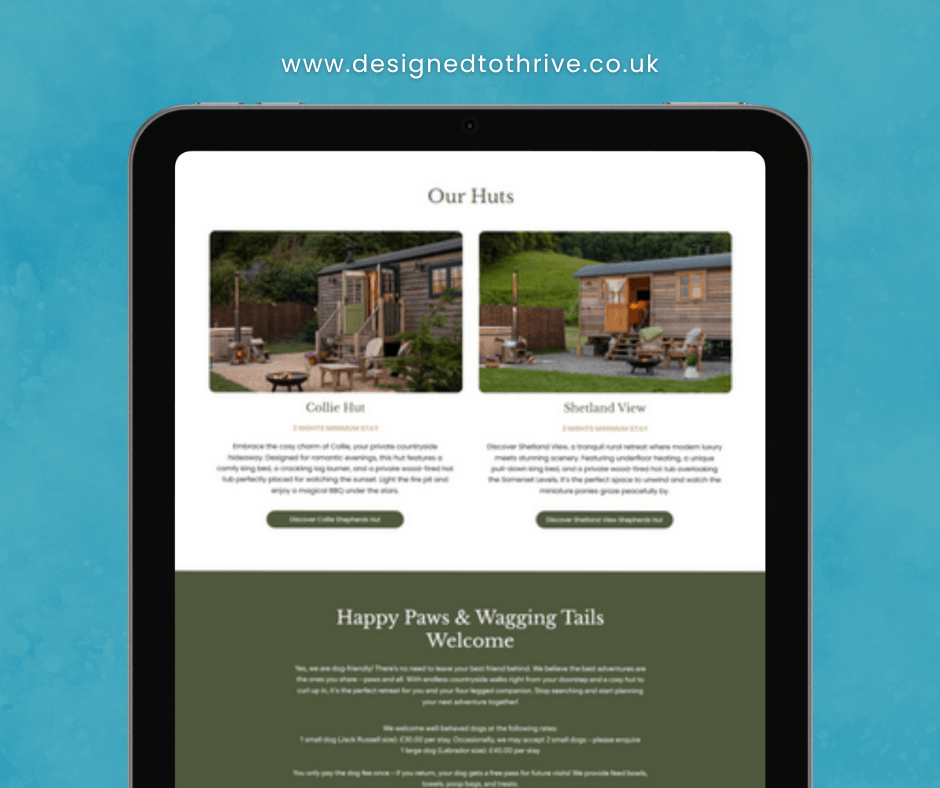 Luxury meets rustic charm - that's exactly what this Wix Studio website delivers. I customised one of my premium templates to elevate the Collie Shepherd Huts brand, using a bold design and vibrant imagery while staying true to their established, relaxed rural vibe. The new site is designed for maximum profitability by putting the booking process directly into the client's hands.